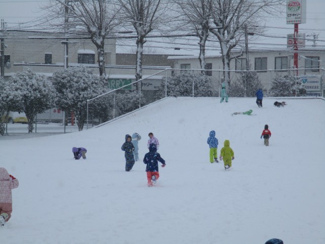 グラウンドに降り積もった雪の上で楽しく遊びました。小学校での初めての雪遊びです。みんな楽しそうに遊んでいました。