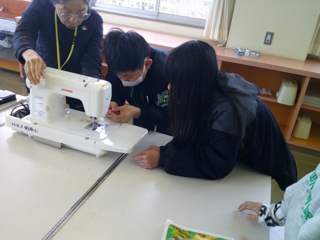 ミシンに上糸と下糸をかけて縫う練習をしてみました。友達と話し合いながら、一人一人が下準備の仕方を覚えていきました。