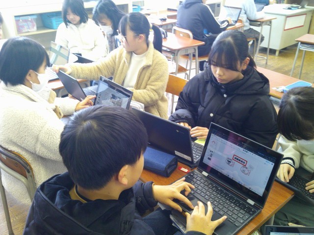 よりよい学校を目指して1年間取り組んできた内容をスライドにまとめています。委員会ごとに自分たちのがんばりを話し合っていました。