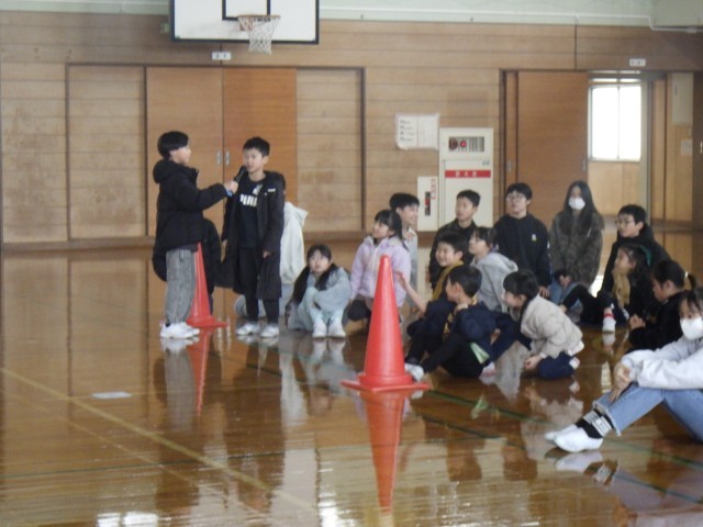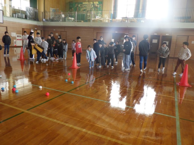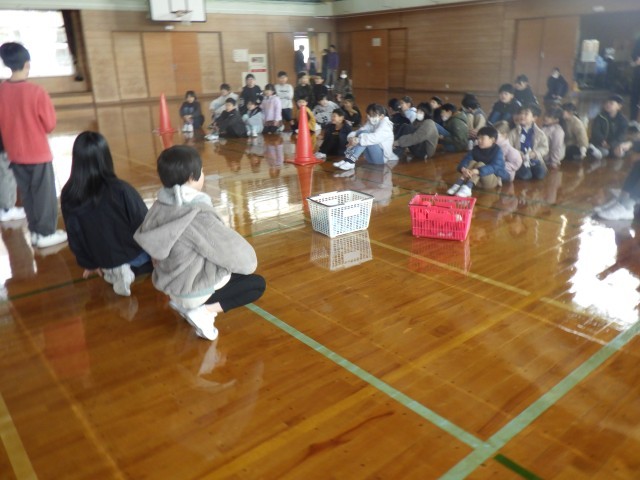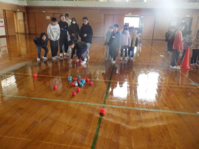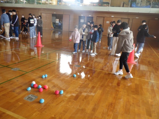 卒業お祝い週間が始まりました。1年生は6年生と交流活動で「ボッチャ」をしました。白いボールに近い方が勝ちです。交互に投げ合いました。結果は6年生が圧勝でした。でも、1年生は楽しい思い出が増えました。