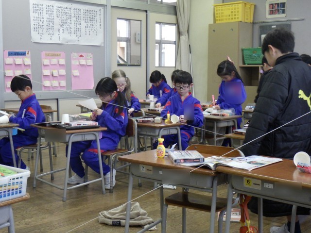 図画工作科で「スルスルビューン」の学習をしています。糸を滑る仕組みを使って、何を滑らせたらいいかを考えて工夫して制作しています。