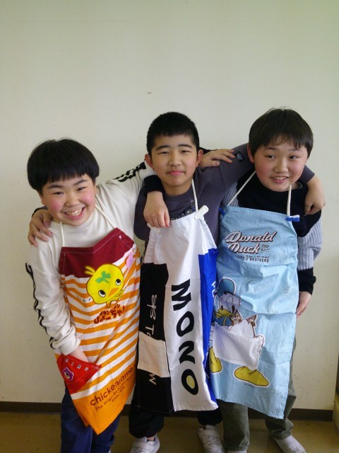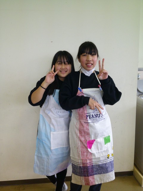エプロンが完成しました!ポケットの形や位置をアレンジしたり、名前を刺繍したりして、こだわりをもって取り組んでいました。