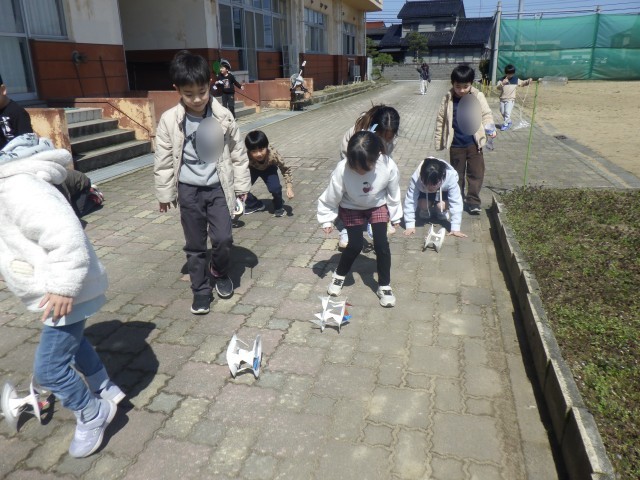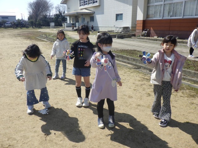 生活科「かぜであそぼう」の学習で、子供たちが作っている遊び道具が出来上がりました。グラウンドでお試しをしました。風を感じて楽しく遊びました。