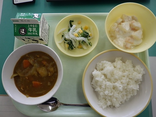 4月13日(月)の給食はカレーライス。1年生の給食がスタートした日にカレーライスで、子供たちは大喜び。上手に給食の準備もできました。