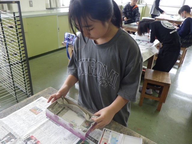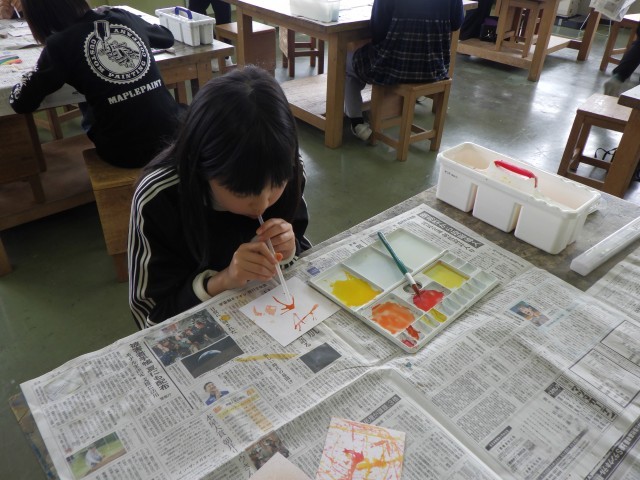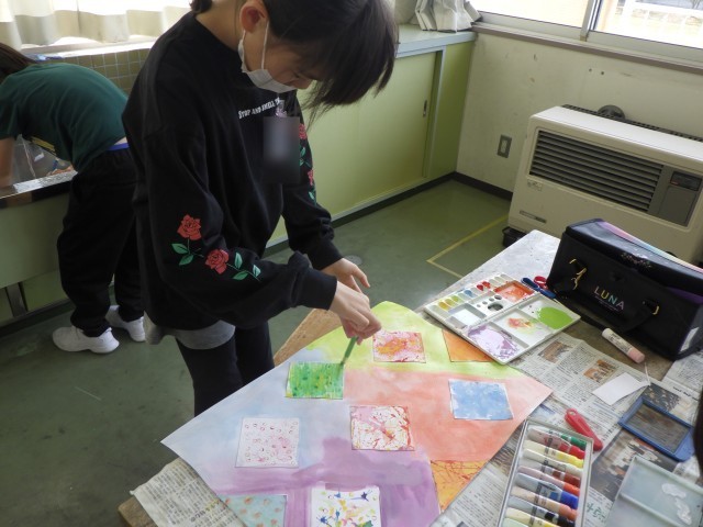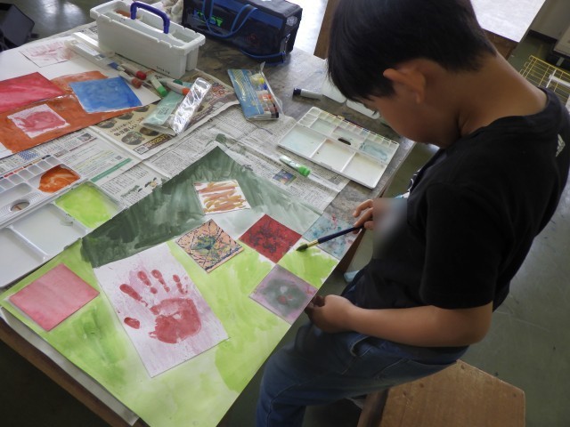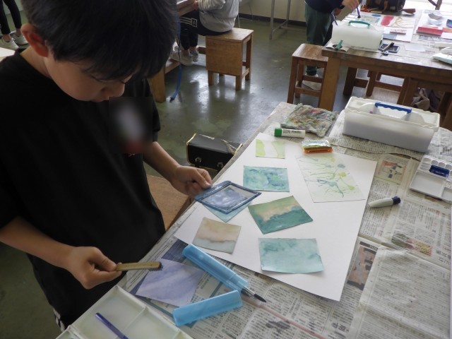 図画工作科「心のもよう」の学習では、水彩絵の具を使って、いろいろな気持ちを表現しました。ストローやビー玉を使って模様を付けるなど、道具や筆の使い方を工夫しながら様々な方法で自分の気持ちを表す作品を作りました。友達の作品を見て「素敵な模様だね」「ずごい!」「どうやってやったの?教えて」と対話しながら作品作りに取り組みました。