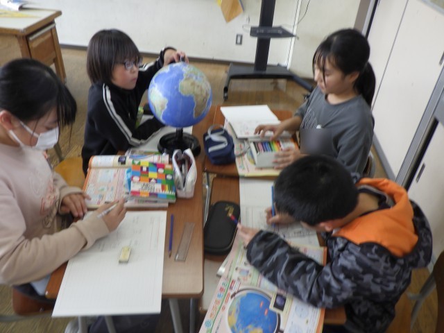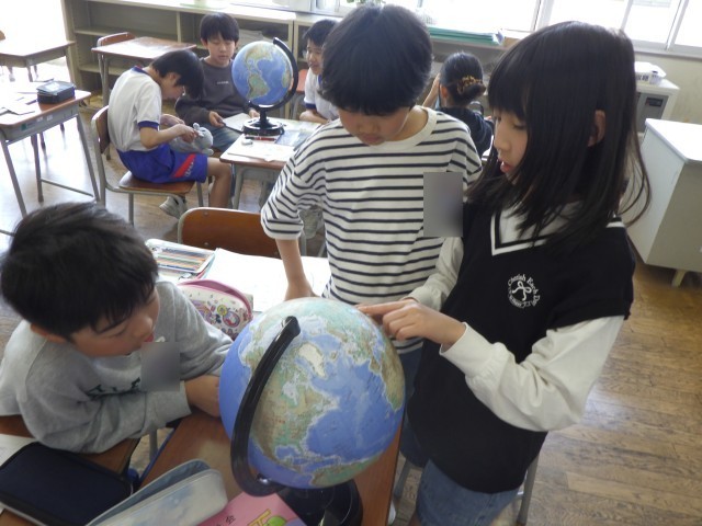 社会科の学習では、地球儀を使って経線や緯線、日本の位置等を調べました。また、国探しゲームでは、班で協力して地球儀を回し、国を探していました。