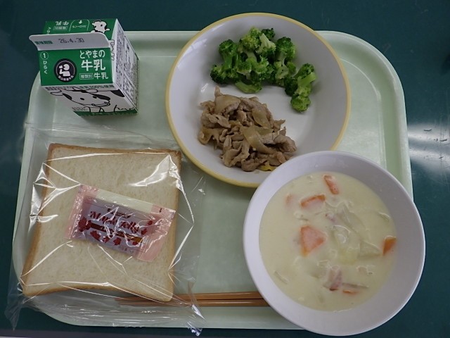 【今日の献立】食パン、ポークソテー、ゆでブロッコリー、クリームシチュー、メープルジャム、牛乳