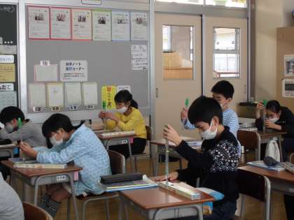 空気の温まり方を調べるために、教室内の温度を測っています。床の近く、机の高さ、いすに上った高さの3カ所を測定しました。空気はどのようにして温まっていくのでしょうか。今後の実験も楽しみですね。