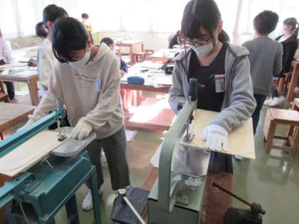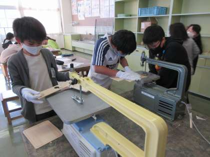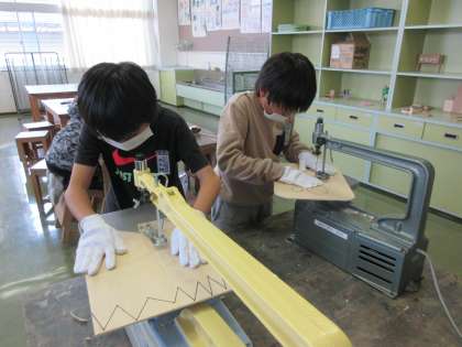 電動糸のこぎりを使って伝言板を作製しています。子供たちは慎重に作業を進めています。