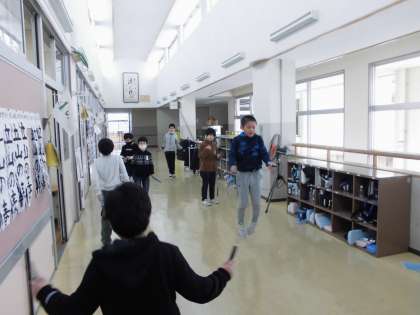 ランランタイムの様子です。室内でのトレーニングは、縄跳びです。今できる技をレベルアップさせたり、まだできない技に挑戦したりしています。これから冬になり、外でトレーニングできない日が続きますが、室内でも元気よく運動している子供たちです。