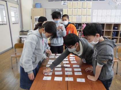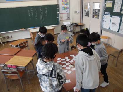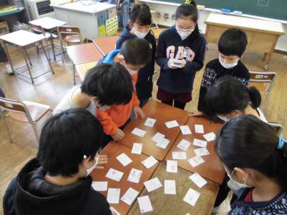 国語の学習で、「冬の楽しみカルタ」を作り、みんなで行いました。熱戦が繰り広げられていました。