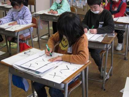 子供たちは、「ら」の一画目がマス目のどの位置から始まっているのか、丸く書くところはどこなのかなど考えながら「ら」を何度も練習しました。