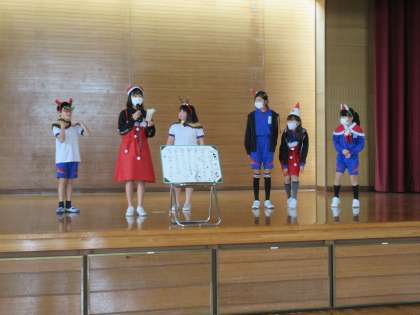 サンタに扮した集会係が楽しい学級集会を開きました。各係からの出し物はクイズやスポーツなど盛り沢山でした。子供たちの思い出に残る集会になったようです。