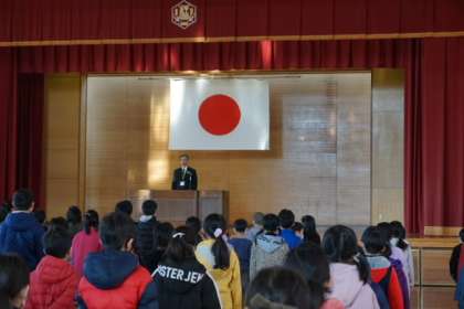 式では、校長先生が、2学期を振り返り、挑戦・笑顔・元気の「プラスワン」について話されました。