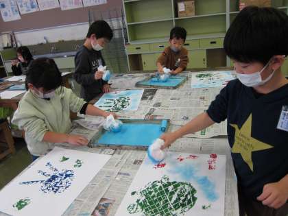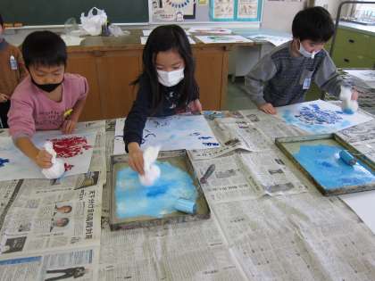 子供たちは、生き物の形や模様など、自分が想像したものを表現しようと何度も作り直していました。生き物を印刷したあと、周りの海を絵の具で付けました。子供たちは、完成した自分の作品を見て、自分の思ったような作品になり、とても満足した様子でした。