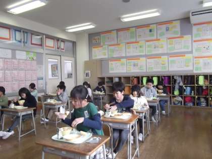 2年生は、毎日おいしくもりもり給食をいただいています。その中で、今心がけていることがあります。それは、ごみを小さくすることです。毎日おいしい給食を作ってくださる調理員さんには様々なかたちで感謝の気持ちを表すことができます。後片付けをきちんとすることもその一つです。今は、ごみをできる限り小さくまとめることで、ごみの量を減らし、感謝の気持ちを伝えることを大切にしています。今日の給食はパンだったので、こんなに小さく袋を縛っていました。このようなことを積み重ねることで、自分の生活や身の回りも整えて、気持ちよく過ごしていこうとしている子供たちです。