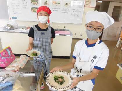 家庭科では、調理実習で青菜のおひたしをつくりました。グループで役割分担し、手際よく調理をしました。「上手にできた」と喜ぶ子供たちでした。