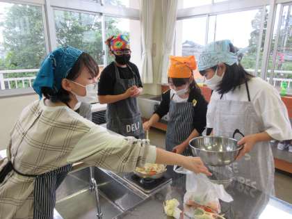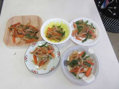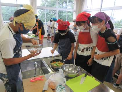 調理実習を行い、班の友達と協力して手際よく作業を進めました。おいしい野菜炒めを作ることができました。