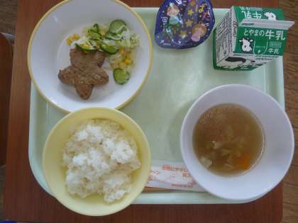 献立は、ごはん、星形ハンバーグ、コーンサラダ、天の川スープ、七夕デザート、牛乳でした。