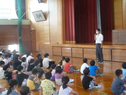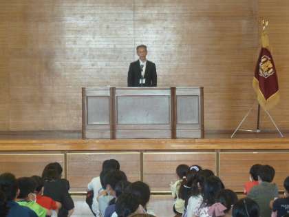 校長先生から、「あいさつ」「自主学習」などの1学期のがんばりについてと、目当てをもった夏休みの過ごし方ついてのお話がありました。