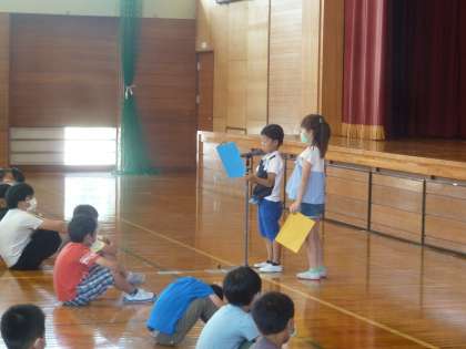 次に、2年生2人が全校児童を代表して「1学期の振り返りと2学期のめあて」の発表をしました。それぞれの頑張りが伝わってくるとてもすばらしい発表でした。