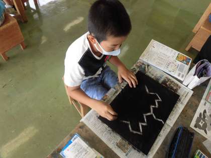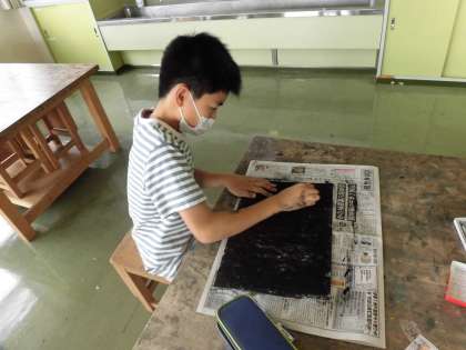 図工では、コンテで画用紙を塗り、消しゴムで消すことで形や模様をかきました。指でこすって色をぼかしたり、塗り込んだりして作品をつくりました。