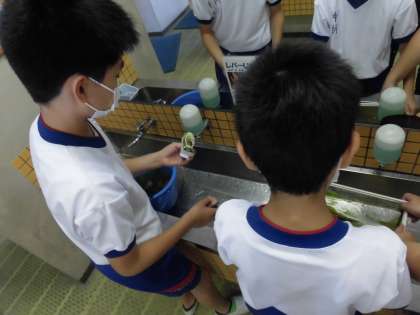 休み時間に金魚の水槽の水替えをしました。自分の役割に責任をもって働く子供たちでした。