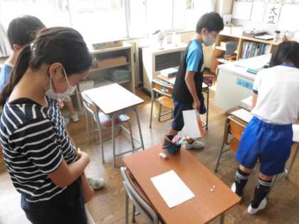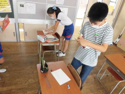 国語では、一つの漢字にいろいろな音があることを学習し、漢字クイズを作りました。友達の作った問題を解いて回り、楽しく学習しました。