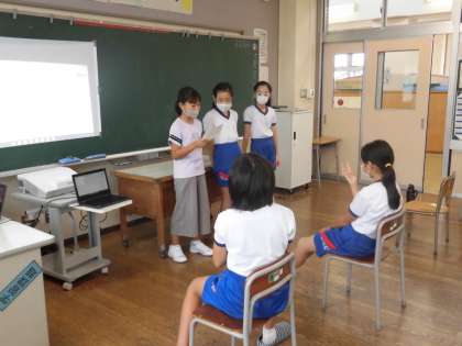 学級活動の時間に、お楽しみ集会をしました。ジェスチャーしりとりやイラストクイズをして楽しみました。