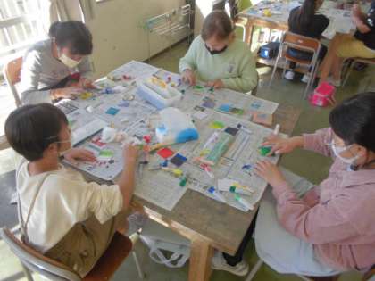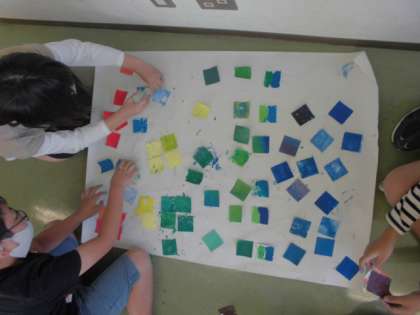 4年生図画工作科の「色合いひびき合い」の学習では、小さな紙に直接絵の具を出し、指で色を混ぜながら、自分のお気に入りの色合いをつくり出しました。子供たちは、絵の具が混ざっていろいろな色ができていくことを楽しんだり、驚いたりしながら活動を楽しみました。活動のまとめとして、グループのメンバーの作品を合わせ、テーマを決めて発表しました。