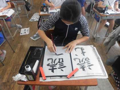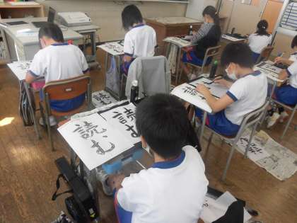 書写では、毛筆で「読む」の字を書きました。漢字とひらがなのバランスを考えて書きました。
