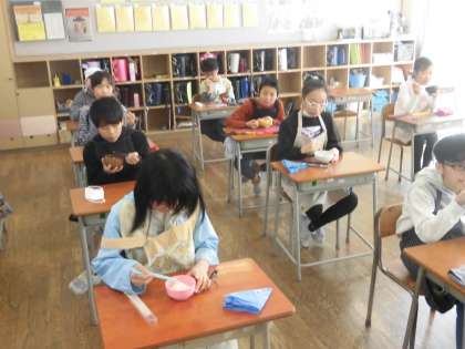 家庭科では、調理実習でお米を炊きました。班の友達と協力して、手際よく調理や片付けをしました。稲作体験でつくったお米をおいしくいただきました。