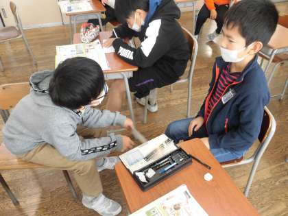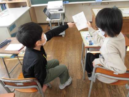 外国語では、オリジナルのピクトグラムを作って、友達と紹介し合いました。英語を使って楽しく活動することができました。