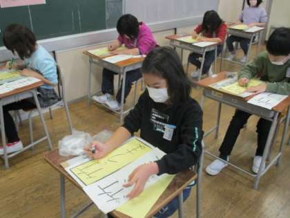 リモートで始業式を行った後、書初め大会が行われました。とても静かな中で、集中して一画一画確かめながら、丁寧に「竹うま」と書くことができました。
