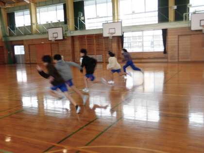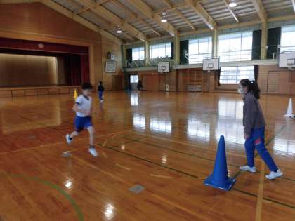 寒い中、走る運動をしました。ドリブルをしながら走ったり、いろいろな体勢からスタートダッシュをしたりして、いろいろな動きを楽しみました。
