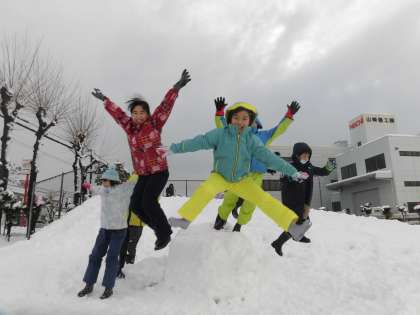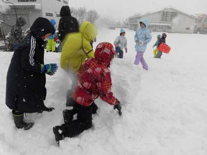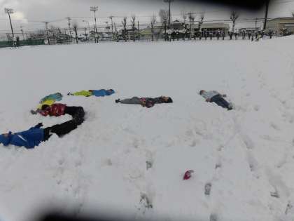 雪の積もったグラウンドでソリをしたり、オブジェをつくったりして楽しみました。冬を満喫しました。