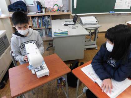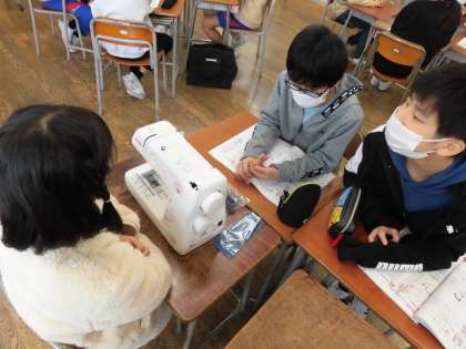 家庭科では、ミシンの使い方を学習しました。ミシン縫いの良さを確認してから、実際にミシンを触って動かし方を学びました。エプロン作りを楽しみにしている子供たちです。