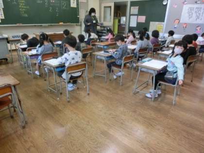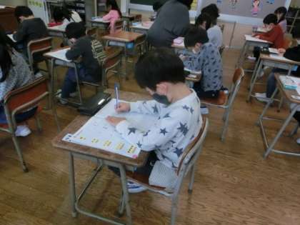 1年生が算数で、数字の2を練習しています。「まるく書くところが難しい」「最後を止めるとかっこいいね」これから小学校で何百回、何千回と書く数字です。鉛筆を正しく持って真剣に練習しました。