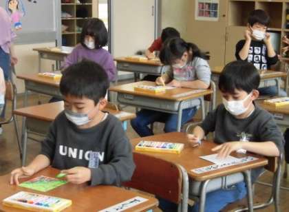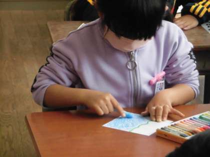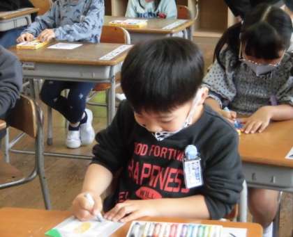 図画工作科「かきたいものなあに」で、自分の好きなものの絵をクレヨンで描きました。「わたしはぶどうが好き」「きれいな虹を描いたよ」と楽しそうに話しながら絵を描き上げていました。
