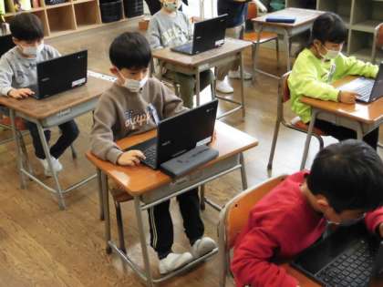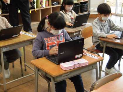 初めて一人一台端末を手にした子供たち。両手でしっかりと持って運び、先生の話をよく聞いてパスワードを入力し、クラスルームを開くことができました。また、カメラを開き、自分の顔を撮ることもできました。これから何度も使うことになりますが、約束を守って学習に利用していきたいと思います。