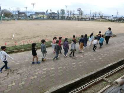 1年生が、外に出て校舎の周りを歩きました。「花壇にチューリップがさいているよ」「外から見ると、職員室はこんな所にあるのだね」「広いグラウンドだな」見る場所をかえると、いろいろな発見があるようです。