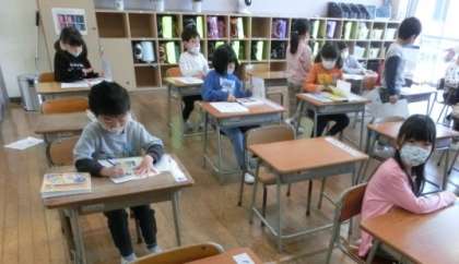 1年生の朝学習では、プリントで数字の3を練習したり、絵に色を塗ったりしています。終わった子供から先生に提出するなど、だいぶ小学校の生活リズムに慣れてきました。