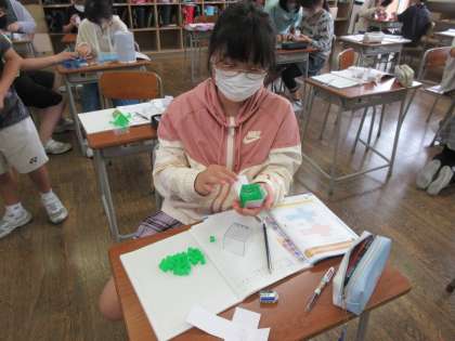 体積を求める学習が始まりました。今日は1立法センチメートルのブロックを使い、直方体や立方体の体積を求めました。