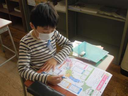 社会科では、都道府県名と場所を学習しました。富山県がどの県と接しているか、どの地方なのかを地図で確認しました。