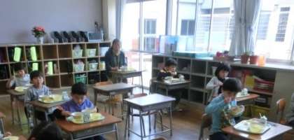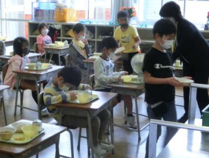 今日の献立は「麦ごはん、カレー、福じんあえ、フルーツヨーグルト」。1・2年生の学級では、ごはんやカレーのお代わりする子が続出でした。