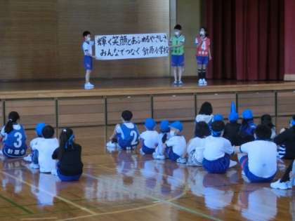 今年度の児童会スローガンを発表しました。「輝く笑顔とあふれる優しさ みんなでつなぐ針原小学校」このスローガンに向かって、針っ子125名が力を合わせて、よりよい学校をつくっていきます。