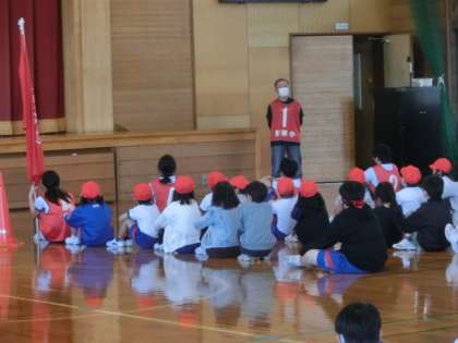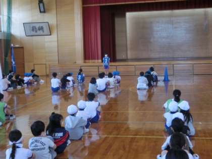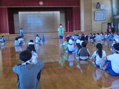 赤白青の各団長が発表されて、それぞれの意気込みを聞きました。運動会はじめ一年間、団長を中心に、色別なかよし斑活動が始まりました。