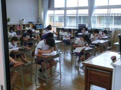 真剣に漢字テストに取り組む5年生。確実に覚えているかドリルを見ながら確かめています。