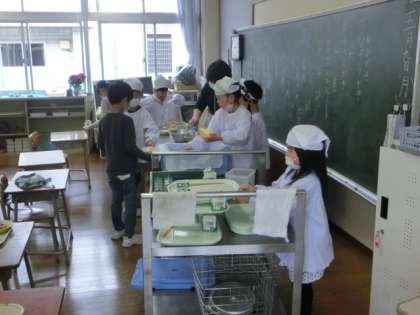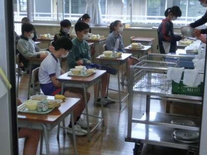 「ごはん、乳麺、赤魚の塩焼き、入り大豆あえ、バナナ」でした。画像は、自分たちでしっかりと準備をして、静かに待つ2・6年生。