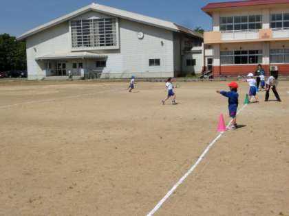 初めて1〜3年生が、グラウンドで折り返しリレーの練習をしました。体育館より長い距離を力いっぱい走り、バトンをつなぎます。